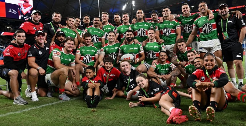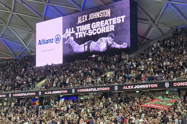 41,424 rugby league fans came tonight to see rugby league history achieved. And they weren't disappointed when Alex Johnston became the greatest NRL rugby league try scorer in the 118 year history of the game, scoring his 213th try in spectacular fashion. The game started with a torrid openning period where both teams had field position and opportunities to score. It was the Sydney Roosters, who opened the scoring after sustained presure and a soft surface saw Cherry-Evans step Murray to cross. More pressure from the Sydney Roosters saw Tupou step a scrambling defence to score. South Sydney found themselves down 0 to 12 early in the contest. South Sydney then hit back after a dropped ball by Topou, gifted South Sydney field position. A well placed kick by Sullivan forced a drop out and soon after it was a backline play that saw Mitchell send Johnston over out wide, to equal Ken Irvine's try scoring record with his 212th try. Mitchell converted the try. The teams then went into the break with South Sydney behind by 6 to 12.