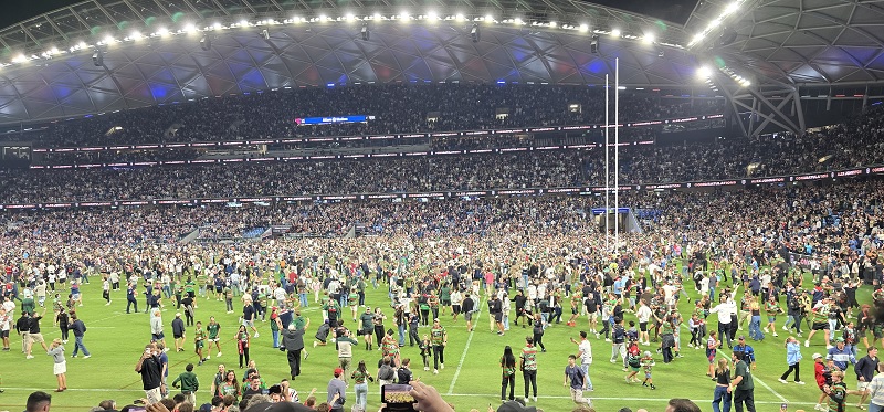 After the break it was South Sydney who opened the scoring immediately when Fifita broke the line, passed to Michell who ran down field and set up Alex Johnston finish off the try running 40 metres to score the record breaking 213th try in spectacular fashion. The stadium erupted in to scenes of joy as thousands of fans jumped the field dyfing 2 year bans and $5,500 fines as the rugby league public crowned Alex Johnston the "Greatest NRL try scorer", picking him up as fans swarmed his achievement. Play stopped as players and fans swamped Johnston, before all players were ushered off the field and back to the dressing rooms. Alex Johnston donned a special record breaking jersey for the rest of the match. It took over 10 minutes for playing field was cleared of both fans and litter, play resumed with Mitchell converting the try from the sideline. 12 all. A penalty from Fifita and a dropped bomb from Gray, gave the Rooster field position, and they scored out wide to regain the lead. A further penalty goal extended their lead to 8 points. Then with 10 minutes to go South Sydney hit back when Wighton, who had just shifted to halfback, kicked in behind the line for Grahamm to score. Mitchell added the extras. 18 to 20. The Roosters scored late in the game from a gubber in goal to win the contest 18-26. In a uncanny co-incidence the 18 to 26 losing scoreline was exactly the same scoreline in the game Ken Irvine broke the try scoring record. Johnston was presented the game ball by the Australian Prime Minister and Rabbitohs #1 fan Anthony Albanese.