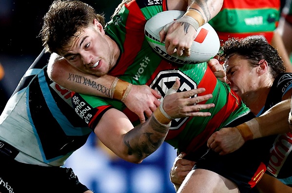 The South Sydney Rabbitohs have suffered a heartbreaking defeat at the hands of the Cronulla-Sutherland Sharks, going down 14-12 in Gosford in the final game of NRL Super Saturday. With the weight of possession and several crucial calls going against them, the Rabbitohs did very well to stay in the contest. They defended with incredible heart, and refused to give up even when they were down by eight points with three minutes to go. In attack, Jye Gray was instrumental for South Sydney, running for a team high of 151m, setting up a try and putting on two line-breaks. It was not enough however, to sway the result in their favour when it counted, with the Sharks too good as they held on for the win. The Sharks were first to trouble the scorers when they received a penalty in range of the posts. Nicho Hynes slotted the goal for a 2-0 lead after eight minutes. Hynes seemed to have orchestrated the away side’s first try of the game, putting second rower Billy Burns through a gap close to the line. However, the pass was called forward, and the Rabbitohs were off the hook after a tough start to the game. South Sydney squared the ledger with a penalty goal of their own after Jack Wighton wasn’t allowed to play the ball correctly due to interference in the ruck. Isaiah Tass made no mistake with the kick, levelling the scores at two all at the 20 minute mark. The Sharks again looked to have scored the first try of the game through a darting run from Hynes, however closer inspection from the bunker revealed that Lewis Dodd had held his opposite man up with a spectacular defensive effort. The Sharks then dropped the ball on the next play in what was a fantastic win for the Red and Green defence. In a half of football where they had just 43% possession and spent plenty of time defending their own line, the Rabbitohs managed to take the unlikeliest of leads into halftime when Jye Gray put Tyrone Munro over in the right corner just seconds before the siren. Tass missed the difficult conversion and South Sydney went to the break leading the Sharks 6-2.